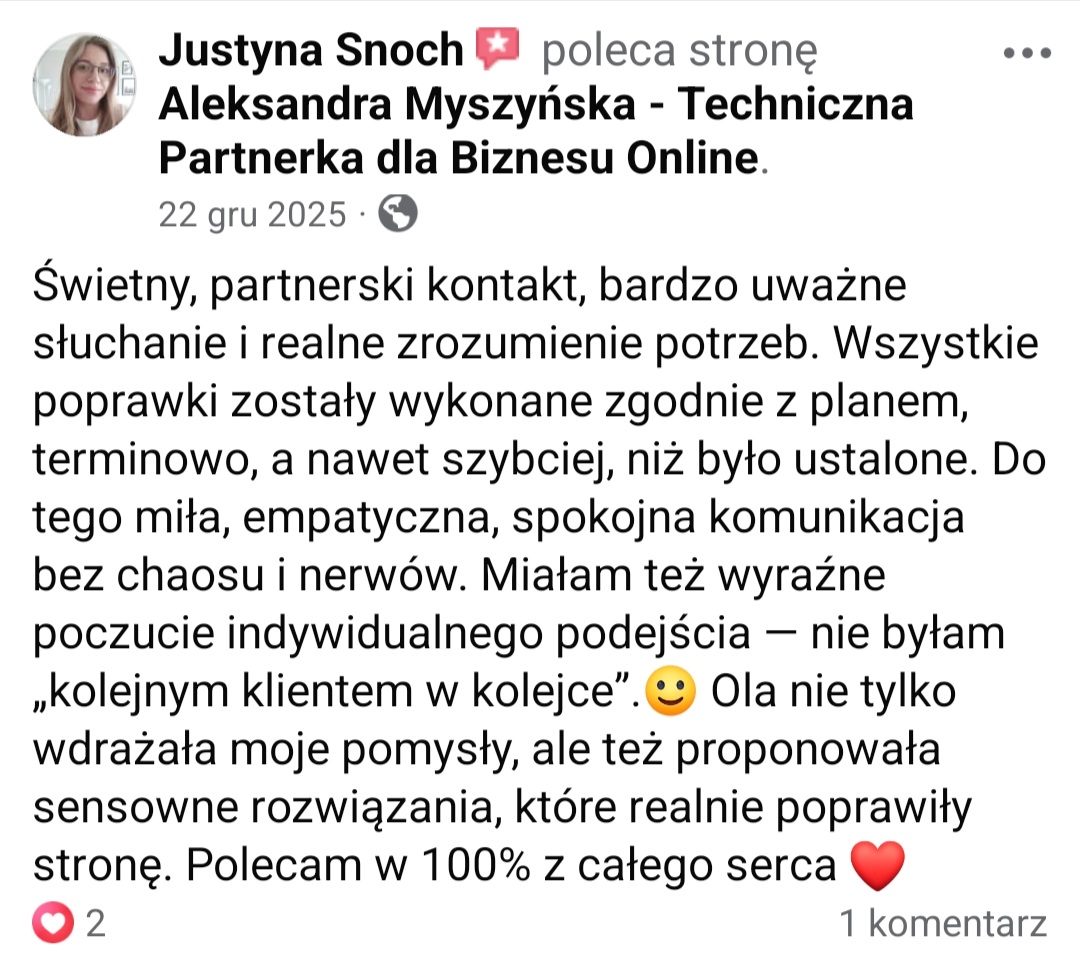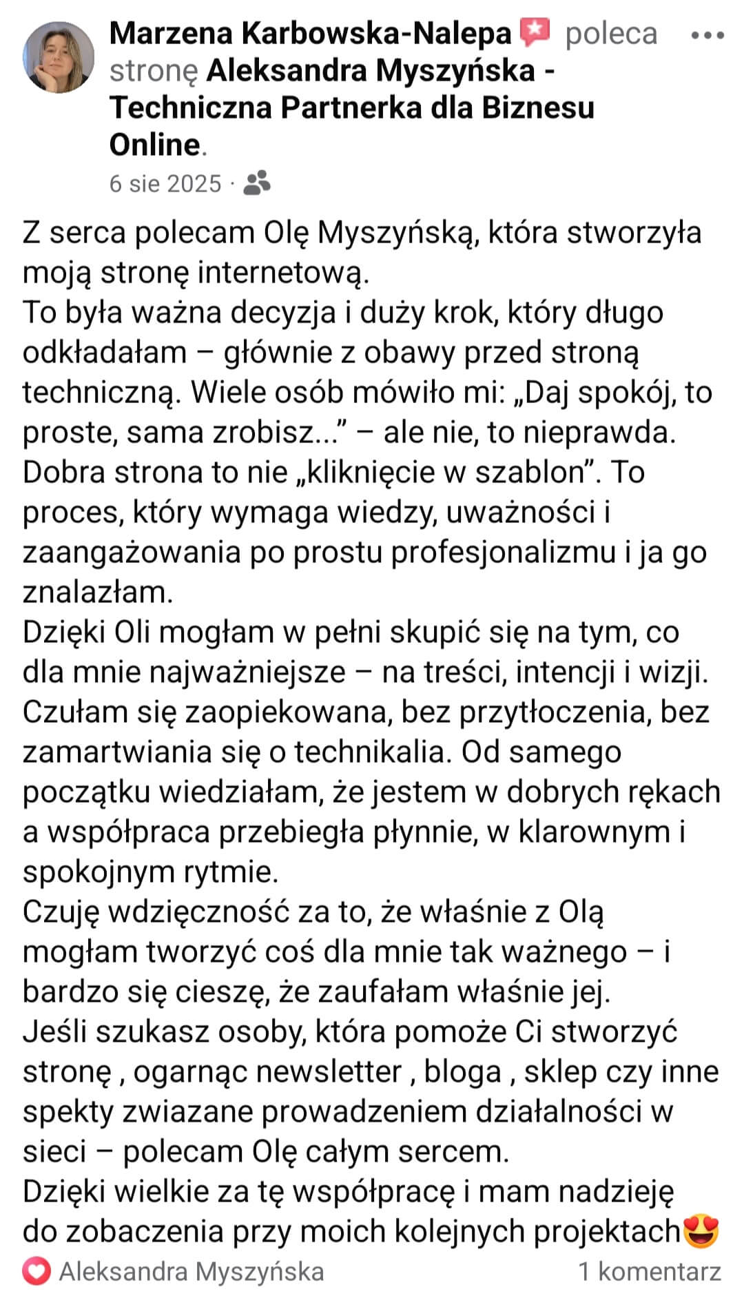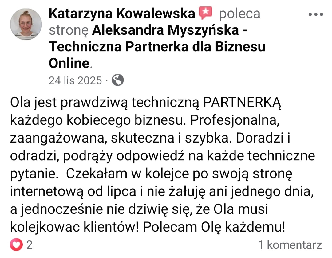 Tworzę i obsługuję ich strony, sklepy, platformy kursowe oraz newslettery, żeby mogły prowadzić swój biznes, nie polegając wyłącznie na social mediach.