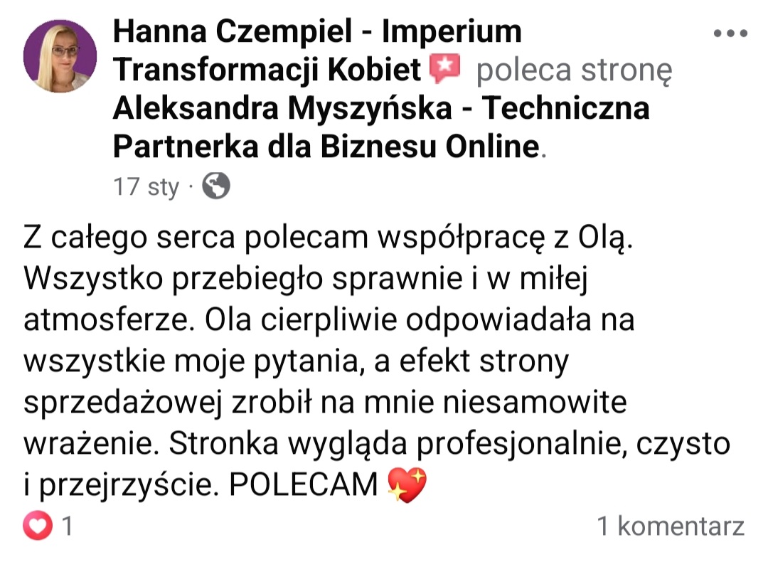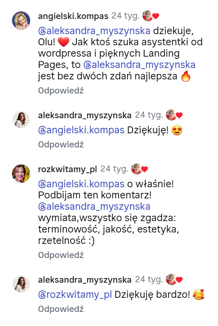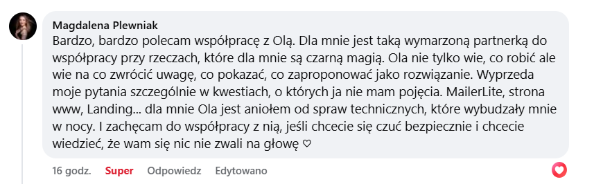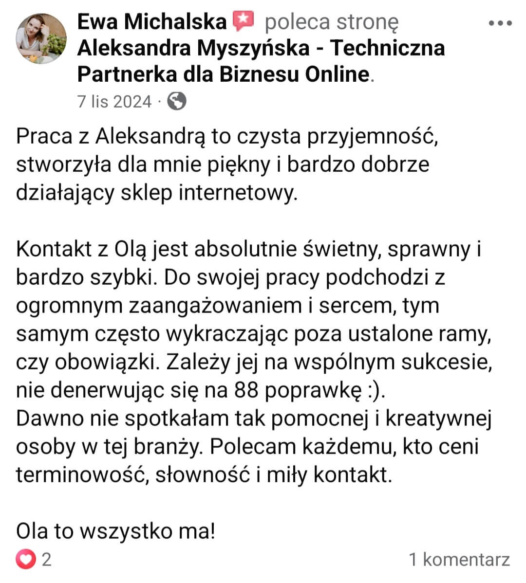 Tworzę i obsługuję ich strony, sklepy, platformy kursowe oraz newslettery, żeby mogły prowadzić swój biznes, nie polegając wyłącznie na social mediach.