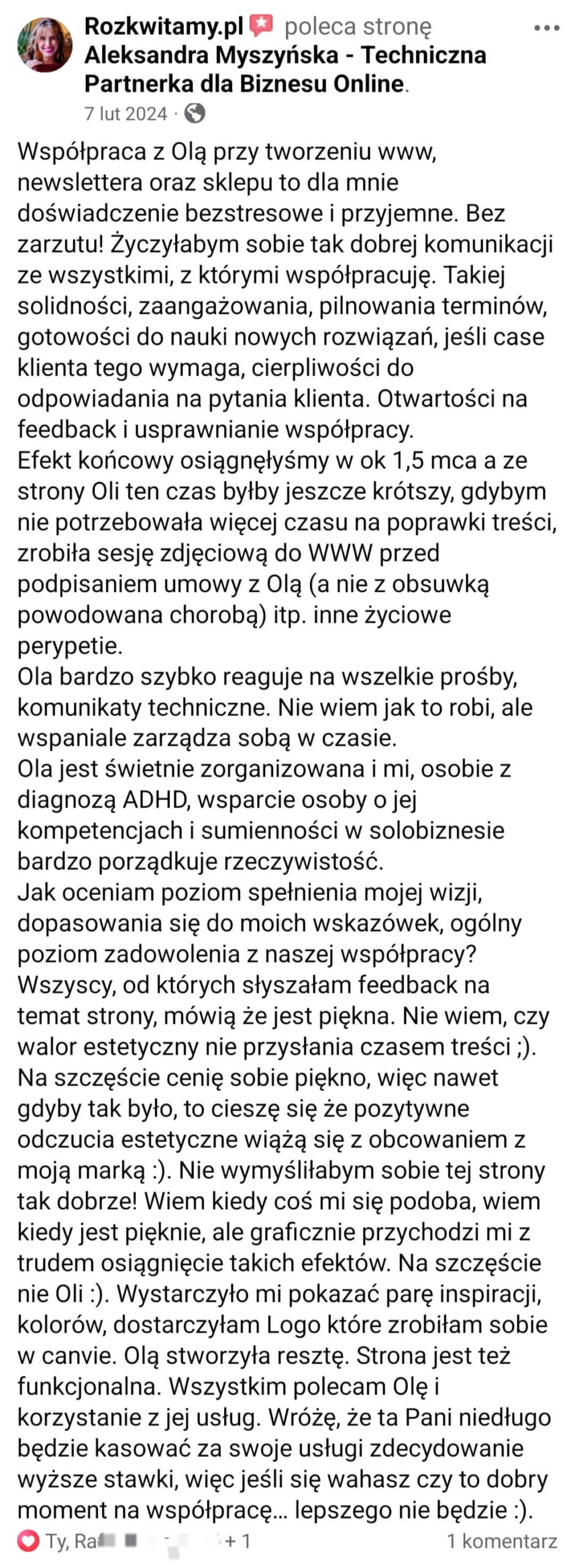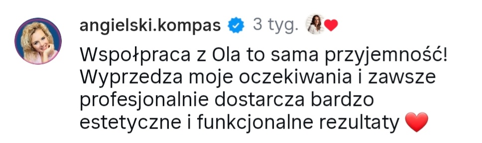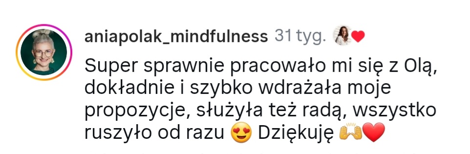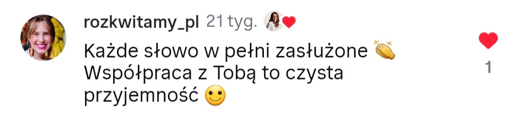 Pracuję z zaangażowaniem i konsekwencją. Szukam rozwiązań i dbam o sprawną komunikację oraz dotrzymywanie ustalonych terminów. Lubię to, co robię i regularnie rozwijam swoje kompetencje, uczestnicząc w kursach i szkoleniach. Moja firma jest moją jedyną działalnością zawodową – traktuję ją poważnie i poświęcam jej pełną uwagę, czas oraz przestrzeń do spokojnej, rzetelnej pracy. Tak jak Ty dbam o swoją markę i zależy mi na tym, by moje Klientki zostały ze mną długo i chętnie polecały mnie dalej.